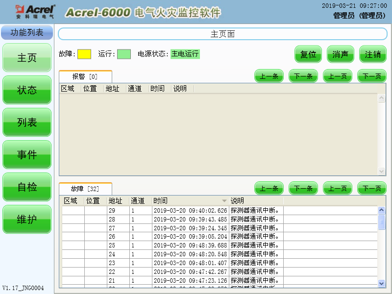 1)監控設備能接收多臺探測器的剩余電流、溫度信息,報警時發出聲、光報警信號,同時設備上紅色“報警”指示燈亮,顯示屏指示報警部位及報警類型,記錄報警時間,聲光報警一直保持,直至按設備的“復位”按鈕或觸摸屏的“復位”按鍵遠程對探測器實現復位。對于聲音報警信號也可以使用觸摸屏“消聲”按鍵手動消除。