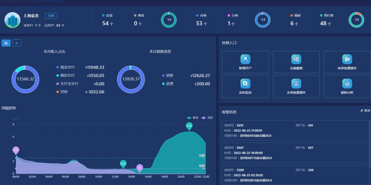 6)報(bào)表中心:提供售電、售水財(cái)務(wù)報(bào)表、用能報(bào)表、報(bào)警報(bào)表等查詢,本系統(tǒng)所有的報(bào)表及記錄查詢,都支持excel格式導(dǎo)出。