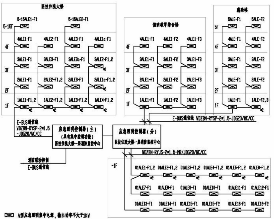 (1)醫療建筑很多區域屬于人員密集場所,火災時的照度要求高,應急照明燈和標志燈數量較多。燈具采用集中電源供電方式,燈具的主電源和蓄電池電源均由集中電源提供,并在集中電源內部統一轉換成DC36V以下電壓后再輸出為燈具配電。