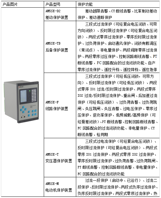 本次針對該35kV配電工程項(xiàng)目中不同保護(hù)對象配置不同微機(jī)保護(hù)裝置,35kV主變柜按主保護(hù)加后備保護(hù)配置:差動(dòng)保護(hù)裝置AM5SE-D2、高后備保護(hù)裝置AM5SE-TB;35kV進(jìn)線柜配置AM5SE-F線路保護(hù)裝置;35kV分段柜配置AM5SE-B備自投保護(hù)裝置;35kV母線設(shè)備柜配置AM5SE-UB PT并列及監(jiān)測裝置;10kV開閉所進(jìn)線柜配置AM5SE-TB低后備保護(hù)裝置;裝置變電所和循環(huán)水場變電所10kV進(jìn)線柜配置AM5SE-F線路保護(hù)裝置;10kV備用出線柜配置AM5SE-F線路保護(hù)裝置;10kV電容補(bǔ)償柜配置AM5SE-C電容器保護(hù)裝置;10kV電動(dòng)機(jī)出線柜配置AM5SE-M電動(dòng)機(jī)保護(hù)裝置,10kV變壓器出線柜配置AM5SE-T變壓器保護(hù)裝置;10kV分段柜配置AM5SE-B備自投保護(hù)裝置;10kV母線設(shè)備柜配置AM5SE-UB PT并列及監(jiān)測裝置。其中,根據(jù)本次項(xiàng)目需求,在AM5SE-TB低后備保護(hù)裝置上增加遙控升檔,遙控降檔,遙控急停,來實(shí)現(xiàn)主變壓器的檔位調(diào)節(jié),并采集變壓器的檔位信號,上傳至電力監(jiān)控系統(tǒng);在35kV側(cè)進(jìn)線柜和分段柜對應(yīng)的保護(hù)裝置增加檢同期功能,確保在停電檢修時(shí),為不影響正常生產(chǎn),能夠可靠合環(huán)。針對各高壓開關(guān)柜配置智能操控?zé)o線測溫一體化裝置ASD320,每面開關(guān)柜配置6點(diǎn)測溫,其中,PT柜配置電池型無線測溫傳感器ATE200,其余高壓開關(guān)柜配置CT取電型無線測溫傳感器ATE400。各型號產(chǎn)品主要實(shí)現(xiàn)的功能如下:
