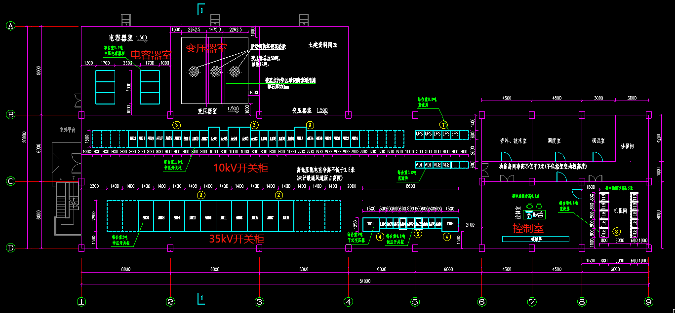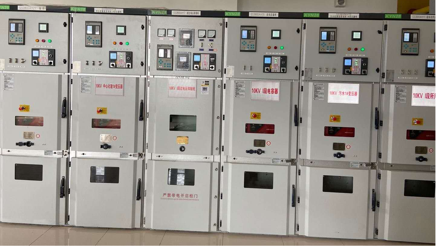 本工程為山東凱瑞英材料科技有限公司35kV供配電工程,共有35kV總變電所一個(gè),包括35kV配電系統(tǒng)和總變10kV配電系統(tǒng); 10kV循環(huán)水場變電所一個(gè);10kV裝置變電所一個(gè)。本工程由兩路35kV電源供電,安裝兩臺容量為16MVA的主變壓器。35kV總變電所配置8面KYN61-40.5中置式開關(guān)柜,進(jìn)出線方式為電纜下進(jìn)下出,柜體顏色為RAL7035,斷路器選用VBG-40.5P-31.5,電流互感器選用LZZBJ9-35D1;配置25面KYN28A-12(Z)中置式開關(guān)柜,進(jìn)出線方式為銅排上進(jìn),電纜下出,柜體顏色為RAL7035,斷路器選用VBG-E-12P-31.5,電流互感器選用LZZBJ9-10C1。循環(huán)水場變電所配置25面KYN28A-12(Z)中置式開關(guān)柜,進(jìn)出線方式為電纜下進(jìn),電纜下出,柜體顏色為RAL7035,斷路器選用CZK2-12-31.5,電流互感器選用LZZBJ9-10C1。裝置變電所配置24面KYN28A-12(Z)中置式開關(guān)柜,進(jìn)出線方式為電纜下進(jìn),電纜下出,柜體顏色為RAL7035,斷路器選用CZK2-12-31.5,電流互感器選用LZZBJ9-10C1。本工程共有一個(gè)35kV變電站和1個(gè)10kV開閉所,2個(gè)10kV變電所,35kV市電引入后經(jīng)由35kV/10kV變壓器,降至10kV電引入開閉所,再由開閉所進(jìn)行分配電能至各個(gè)分變電所,整個(gè)變電站的一次系統(tǒng)干線圖以及平面布局圖如下: