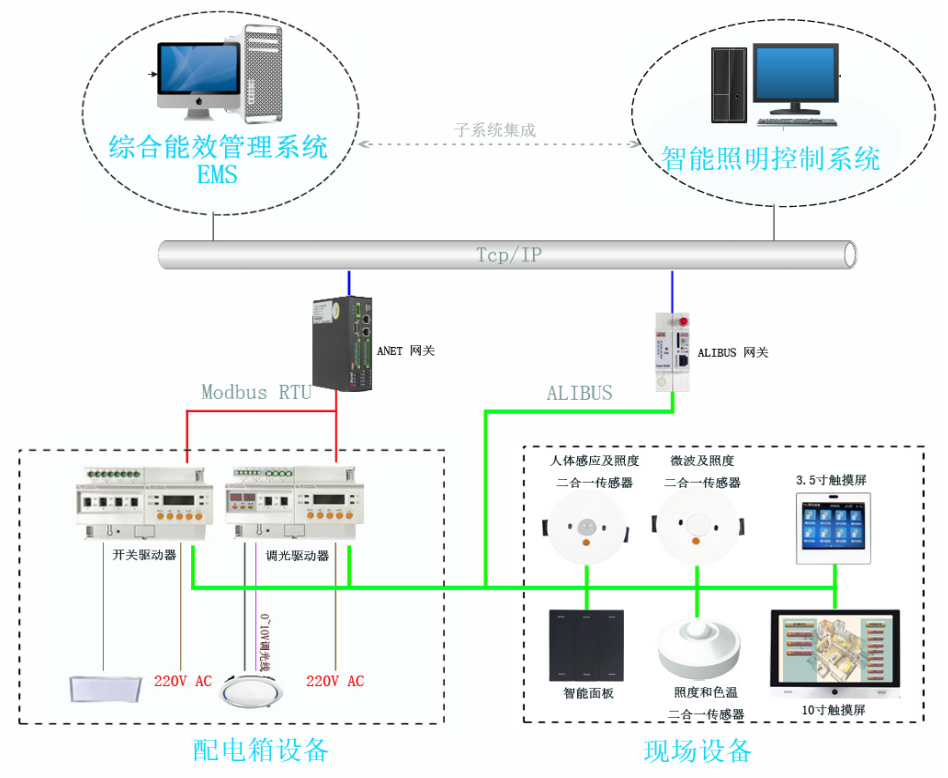 對數據中心機房選用高光效的LED光源燈管替換原有節能燈和筒燈,增加智能照明控制系統。在走廊、電梯前室、洗手間等公共照明區域安裝紅外人體感應傳感器,通過智能照明控制器進行控制,做到人來燈亮、人走燈滅,同時在值班室的Acrel-8000系統主機上也可以集成整個數據中心照明的集中控制和狀態監視,節約照明用電,見圖7。