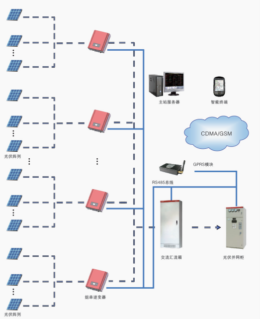 太陽能光伏電站主要由光伏電池陣列、匯流箱、低壓直流柜、逆變柜、交流低壓柜、升壓變壓器等組成,最后產(chǎn)生的交流直接并入電網(wǎng)。針對每個環(huán)節(jié)電力參數(shù)檢測的需要,安科瑞推出了AGF系列光伏匯流采集裝置、ACR10R系列防逆流監(jiān)控裝置、APQM系列電能質(zhì)量在線監(jiān)測裝置、匯流箱及并網(wǎng)柜等產(chǎn)品,分別應用于匯流箱、直流防雷柜及交流柜中,并通過Acrel-2000 V8.0光伏發(fā)電監(jiān)測系統(tǒng)實現(xiàn)后臺集中監(jiān)控。