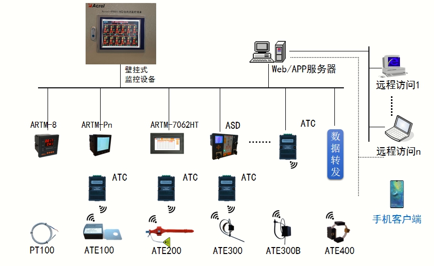 Acrel-2000T/B無線測溫監控設備主要是對測溫點進行實時監測、將溫度數據形成溫度曲線、實時事件告警等功能,同時該裝置還支持數據轉發功能,可并入其他系統。