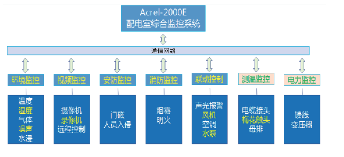 Acrel-2000E配電室綜合監(jiān)控系統(tǒng),可實(shí)現(xiàn)開關(guān)柜運(yùn)行監(jiān)控、高壓開關(guān)柜帶電顯示、電流電壓等負(fù)載運(yùn)行監(jiān)測(cè)、母線及電纜測(cè)溫監(jiān)測(cè)、環(huán)境溫濕度監(jiān)測(cè)、有害氣體監(jiān)測(cè)、安防監(jiān)控,可對(duì)燈光、風(fēng)機(jī)、除濕機(jī)、空調(diào)控制等設(shè)備進(jìn)行聯(lián)動(dòng)控制。實(shí)現(xiàn)動(dòng)力環(huán)境各數(shù)據(jù)的檢測(cè)與設(shè)備控制,優(yōu)化動(dòng)力環(huán)境,避免運(yùn)行環(huán)境的失控導(dǎo)致配電設(shè)備運(yùn)行故障,保證維護(hù)人員安全,延長(zhǎng)設(shè)備使用壽命,實(shí)現(xiàn)配電動(dòng)力環(huán)境的分布式遠(yuǎn)程管理。