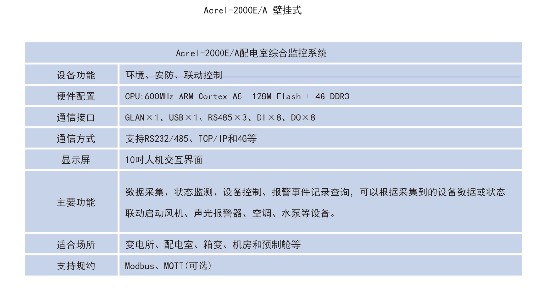 由于硬件資源以及系統(tǒng)軟件上的差別,Acrel-2000E/A作為針對(duì)變電所配電室的環(huán)境輔助監(jiān)控系統(tǒng),只對(duì)環(huán)境參量設(shè)備進(jìn)行在線監(jiān)測(cè);而Acrel-2000E/B與Acrel-2000E/G作為硬件資源豐富,系統(tǒng)功能更為強(qiáng)大的設(shè)備,可以配合我司無(wú)線測(cè)溫以及電力儀表進(jìn)行在線監(jiān)測(cè)。