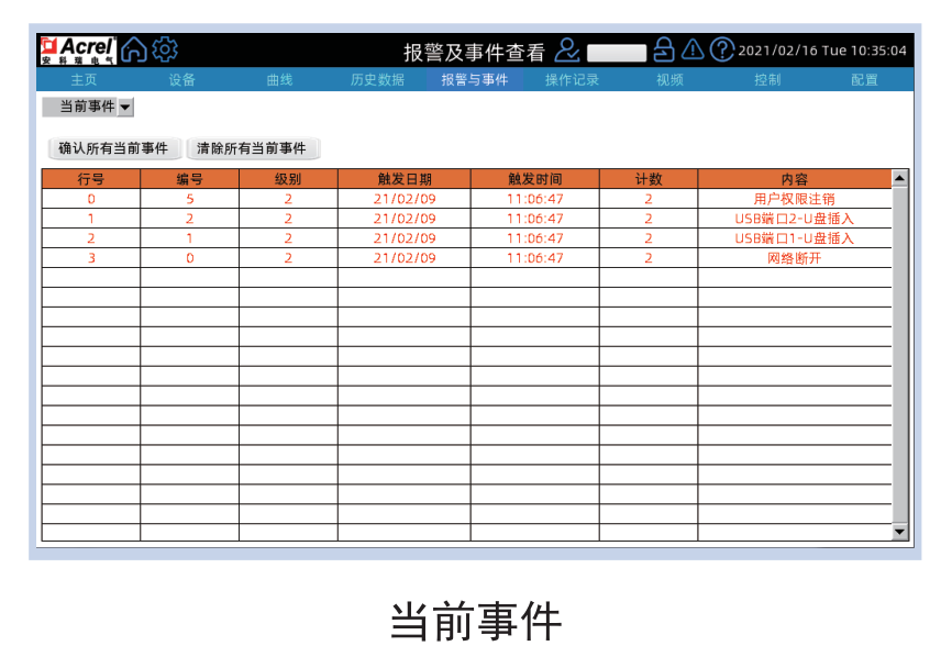 在“當(dāng)前事件”的界面,有事件類型下拉框、事件列表、確認(rèn)全部當(dāng)前事件以及清除全部當(dāng)前事件按鈕共4個(gè)部分,點(diǎn)擊確認(rèn)按鈕可以確定列表中所有還未確認(rèn)的事件,點(diǎn)擊清除按鈕可以清除列表中所有事件。