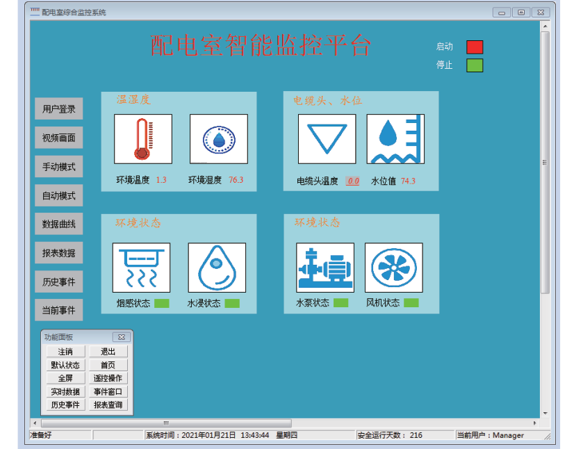 觸摸屏上電進(jìn)入工作狀態(tài)后,默認(rèn)為主界面,在此界面可觀察到配電室環(huán)境溫濕度、SF6氣體和O2濃度等監(jiān)測(cè)信息以及當(dāng)前事件列表。