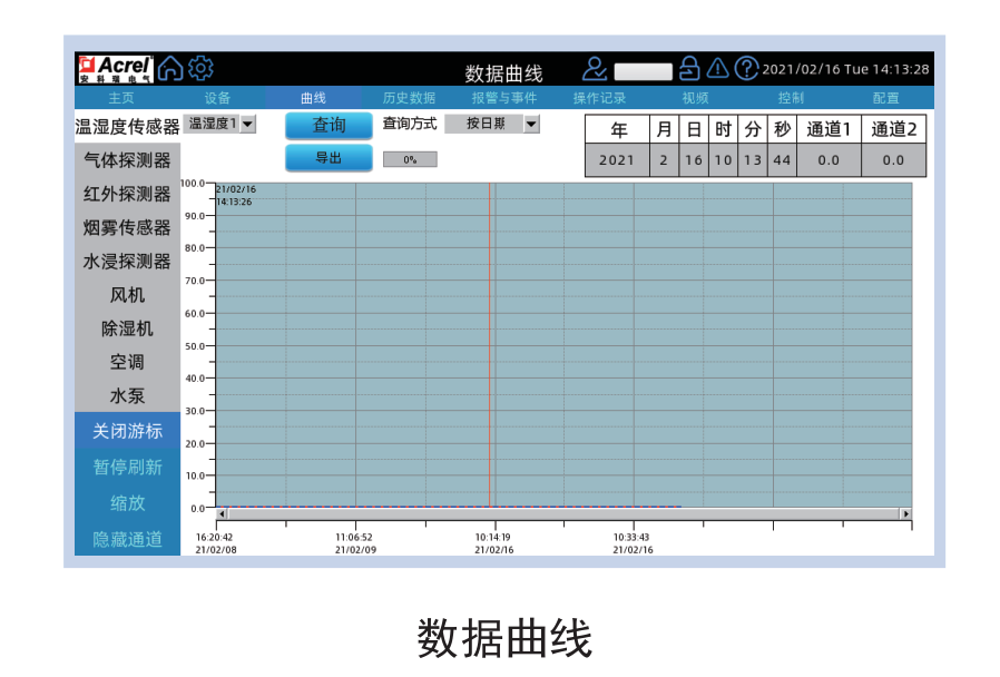 進(jìn)入“數(shù)據(jù)曲線”界面,首先顯示的是溫濕度的溫度及濕度數(shù)據(jù)曲線,同“設(shè)備查看”界面一樣,左邊有設(shè)備列表,點(diǎn)擊列表上的不同設(shè)備名稱可以查看對(duì)應(yīng)設(shè)備的由實(shí)時(shí)及歷史的監(jiān)測(cè)數(shù)據(jù)形成的數(shù)據(jù)曲線曲線上方的查詢及導(dǎo)出按鈕分別提供相應(yīng)的查詢和導(dǎo)出功能,并且可以根據(jù)所選擇的不同查詢方式進(jìn)行不同方式的查詢功能。