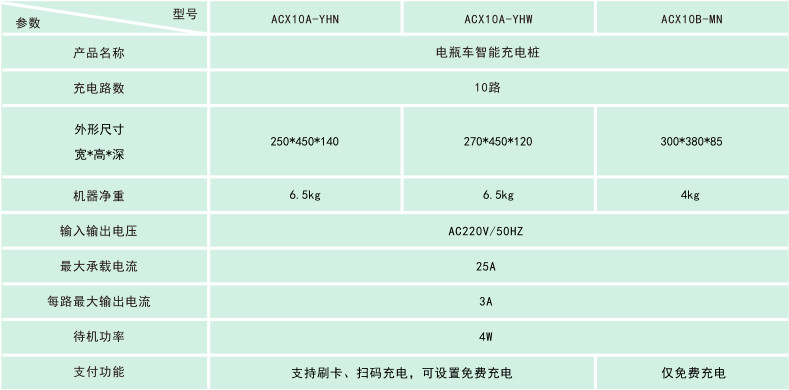 電瓶車智能充電樁是新一代電動自行車智能充電設備,具有交流輸出電源遠程通斷控制、充電安全控制、 電度計量、按時計費功能于一體的交流供電裝置,該裝置能通過電動自行車的車配充電器為電動自行車充電。 支付方式可選擇投幣、刷卡、掃碼使用,設備內部可引出 10 路出線至專用插座,通過電動自行車的車配充電器 完成充電。可連接云平臺給用戶提供安全可靠及智能化的充電服務。禁止非法改裝。