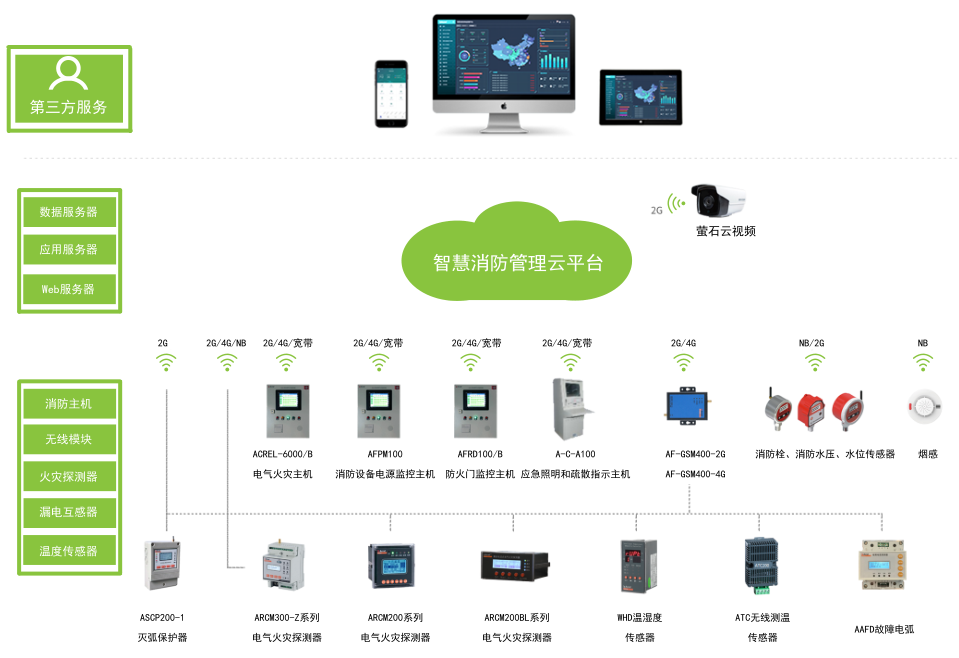 智慧消防管理云平臺(tái)包含了智慧用電子系統(tǒng)、防排煙子系統(tǒng)、消防水子系統(tǒng)、消防設(shè)備電源子系統(tǒng)、防火門子系統(tǒng)、消防設(shè)備管理子系統(tǒng)和視頻監(jiān)控子系統(tǒng)等。