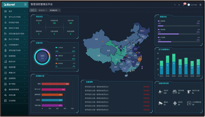 主要展示的內(nèi)容有:項(xiàng)目概況、設(shè)備狀態(tài)、探測器分類、設(shè)備報(bào)警信息、報(bào)警分類、報(bào)警統(tǒng)計(jì)、設(shè)備臺(tái)賬信息等。其中百度地圖可以選配成3D建筑模型。