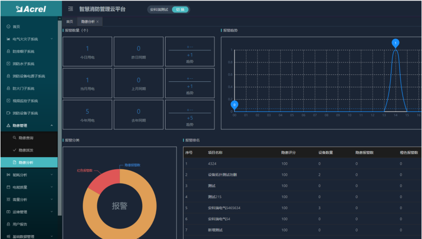 智慧用電子系統(tǒng)可以接入電氣火災(zāi)、孤航電弧、電氣火災(zāi)主機(jī)、滅弧式保護(hù)器探測器和無線測溫探測器等。點(diǎn)擊智慧用電子系統(tǒng)進(jìn)入智慧用電監(jiān)控頁面,點(diǎn)擊第一級(jí)顯示整個(gè)項(xiàng)目的基礎(chǔ)信息和該項(xiàng)目下的所有探測器的信息,點(diǎn)擊末級(jí)節(jié)點(diǎn)顯示具體探測器的監(jiān)控頁面。